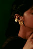 This ear stack features two sculptural gold pieces with fluid, folded forms that hug the ear like molten waves. Designed to layer seamlessly, they create a bold yet elegant silhouette, blending organic texture with a modern, statement-making edge.